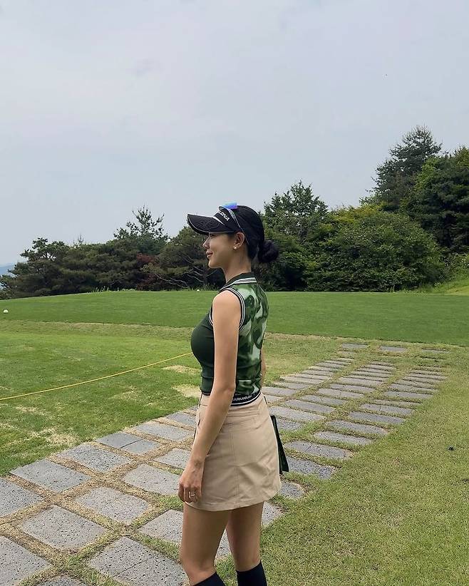 두 번째 사진에서는 아우터를 벗고, 민소매 카모 패턴 톱으로 시원한 스타일링을 보여줬다. 카키 컬러의 밀리터리 패턴은 야외 필드와 자연스럽게 어우러지며 활동적인 분위기를 강조했다. 어깨 라인을 드러낸 민소매 디자인은 실루엣을 한층 더 돋보이게 했고, 허리 라인에 살짝 걸친 스커트는 슬림한 바디라인을 부각시켰다.
