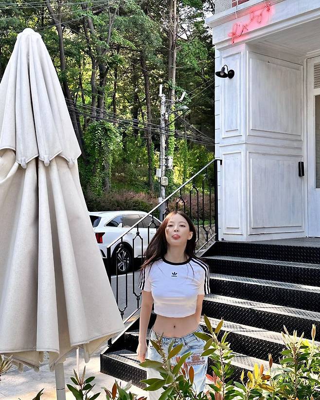 방송인 임보라도 아디다스 반팔티를 입고 나들이에 나선 사진을 게시했어요.