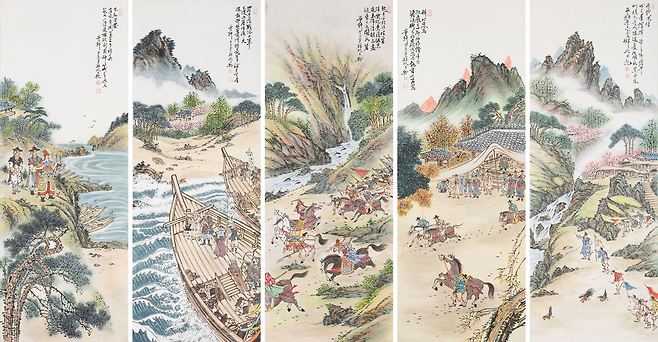 일단 화려한 채색을 가미한 전통 수묵화라는 걸 알 수 있습니다. 산과 물이 어우러진 배경에 계절에 맞는 꽃나무도 곱게 그려 넣었고, 말이나 배가 등장하기도 합니다. 장수와 병사들의 모습도 보이고요. 어떤 중요한 인물에 얽힌 역사적 장면을 그렸구나, 짐작해볼 수 있겠죠.