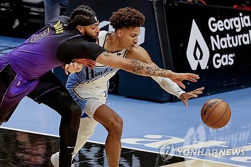 epa11761361 Los Angeles Lakers forward Anthony Davis (L) in action against Atlanta Hawks forward Jalen Johnson during the first half of an NBA game in Atlanta, Georgia, USA, 06 December 2024. EPA/ERIK S. LESSER SHUTTERSTOCK OUT