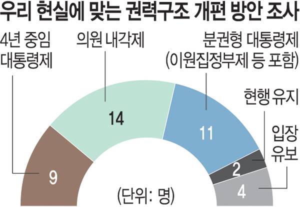 국민일보가 최근 40명의 전문가를 상대로 실시한 권력구조 개편 방안 선호도 조사에서는 의원내각제에 대한 응답률(14명)이 가장 높았다. 다음으로는 분권형 대통령제(이원집정부제 등 포함)가 11명으로 집계됐다. 대통령 4년 중임제의 경우 9명이 손을 들었는데, 대통령 권한 분산이나 삼권분립 강화 등을 조건으로 다는 경우가 많았다. 큰 틀에서 볼 때 전문가들의 청사진은 의원내각제나 분권형 대통령제 두 갈래로 수렴되는 모양새다. 현행 유지는 2명, 입장 유보 의견은 4명이었다.