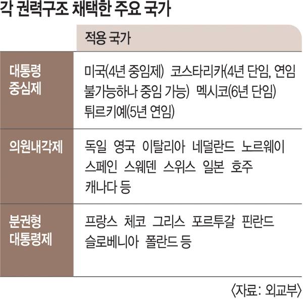 대한민국 헌정사에서 경험한 통치체제는 대통령제가 사실상 유일하다. 의원내각제는 1960년 6월 제2공화국에서 시도됐으나 박정희 전 대통령의 1961년 5·16 군사정변으로 9개월간 존속에 그쳤다. 통치체제의 대안으로 거론되는 이원집정부제나 분권형 대통령제는 시행된 적 없는 낯선 체제다. 12·3 비상계엄 사태를 경험하면서 현행 대통령제의 부작용에 대한 공감대는 상당 부분 형성됐지만 개헌의 방향을 선택해야 할 국민으로서는 어느 쪽도 선뜻 결정하기 어려울 수밖에 없는 상황이다.