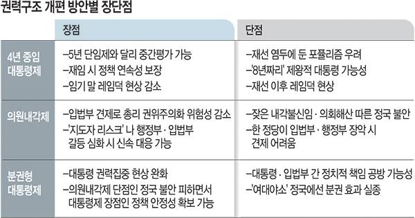 분권형 대통령제를 주장하는 전문가들은 대통령제에 대한 국민 친숙도가 높은 만큼 의원내각제보다 현실적 대안이 될 수 있다는 입장이다. 박상병 정치평론가는 “의원내각제는 국회에서 대통령을 뽑는 식으로 인식해 국민적 거부감이 크고, 아직은 시기상조”라며 “국민은 대통령을 직접 뽑고 싶어한다. 외교·국방은 대통령, 내치는 국회에서 뽑힌 총리가 맡고 상황에 맞게 교체하면 된다”고 말했다.