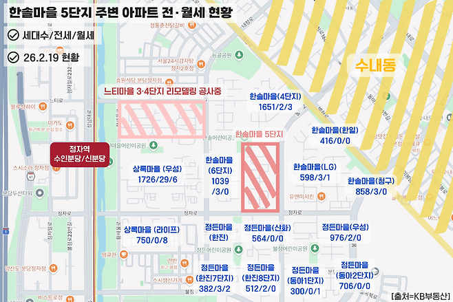 한솔마을 5단지 이주가 한 달 앞으로 다가오면서 인근 전·월세 시장도 즉각적인 반응을 보이고 있는 상황이다. 지난 30일 이주 공고가 발표되자마자 주변 공인중개업소에는 문의가 급증했다는 전언이다. 정자동은 전체 임대 매물의 약 70%가 전세로 구성될 만큼 전세 비중이 높은 지역인데 1000가구가 넘는 대단지 주민들이 동시에 이주 수요로 시장에 나오면 단기간 내 전세 물량이 크게 줄어들 수 있다는 우려가 나온다.