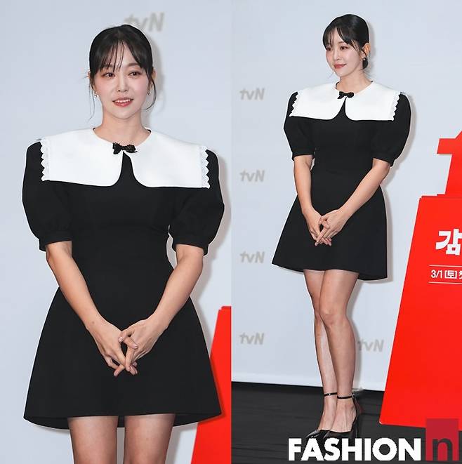이날 김가은은 화이트 케이프가 멋스러운 블랙 미니 원피스룩으로 러블리하면서도 로맨틱한 스타일을 선보였다.
