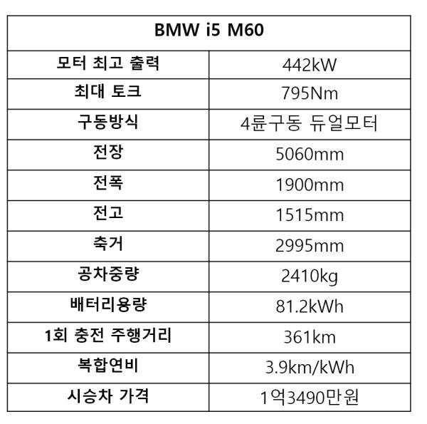 다음 차량은 오늘 시승한 모델 중 가장 강력한 모델인 i5 M60이다. 앞서 i4주행한 트랙 코스와 동일한 코스를 주행했다. 가장 고성능 모델답게 아드레날린이 뿜어져 나왔다. 듀얼 모터 합산 출력 442kW으로 마력 환산 시 592마력이다. 795Nm의 최대토크를 발휘한다. 제로백은 3.8초에 최고 속도는 230km/h이다.