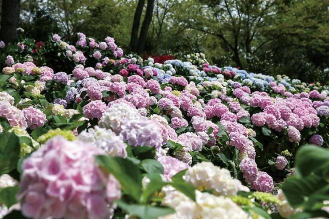 공원 입구에서부터 출구까지 이어지는 산책로를 따라 파란색, 보라색, 분홍색 등 다채로운 빛깔의 수국이 공원을 수놓습니다. 자연 지형을 살려 조성된 공간들마다 수국의 분위기도 달라, 걸을수록 새로운 감성을 만나게 됩니다.