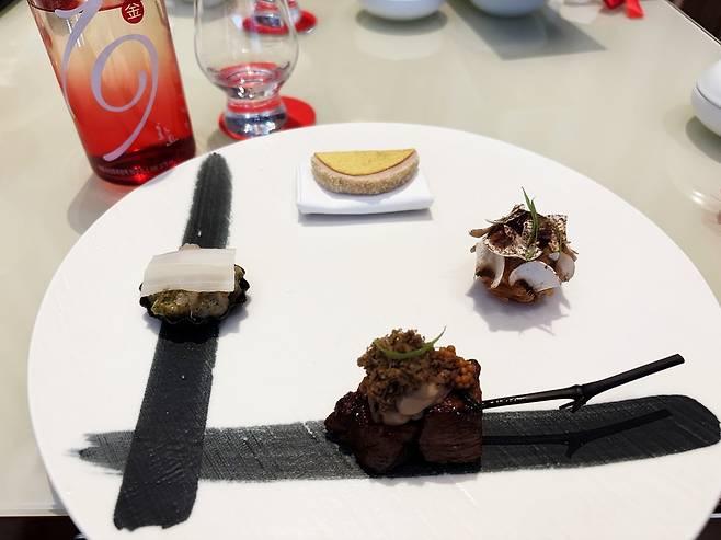 디저트 ‘흑임자 약과 초콜릿’은 흑임자 초콜릿 안에 바삭한 약과를 넣었다. 화요19금이 가진 바닐라, 캐러멜 향을 통해 초콜릿 풍미가 더 진하게 풍겼다. ‘더덕주악’은 전통 디저트인 개성주악을 더덕 조청으로 덧발랐다. 찹쌀과 화요 막걸리 원액을 반죽했다.