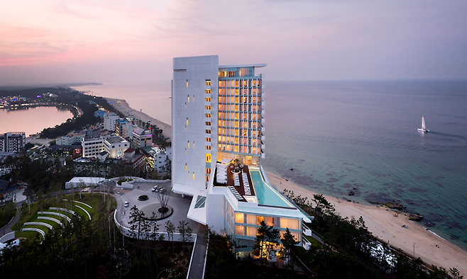 강릉의 명물 경포호에는 랜드마크같은 건물이 하나 있는데요, 바로 우뚝 서서 강렬한 존재감을 알리는 스카이베이 호텔이랍니다. 뒤로는 경포호, 앞으로는 동해바다를 두고 있어 겨울의 새파란 아름다움에 둘러싸여 있는 곳이죠. 특히 바다를 한눈에 내려다볼 수 있는 20층 인피니티풀로 사랑받고 있는데요, 겨울에는 따뜻한 온수풀로 운영하고 있어요. 낮에는 에메랄드빛 동해를, 밤에는 색색 조명으로 낭만적인 분위기를 누릴 수 있답니다.