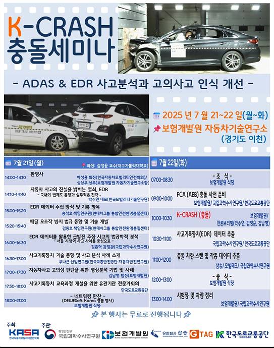 국내 자동차 사고 조사 및 분석 기술의 신뢰성과 투명성을 높이기 위한 ‘K-CRASH 충돌세미나’가 7월 21일부터 22일까지 이틀간 경기도 이천에 위치한 보험개발원 자동차기술연구소에서 개최됐다. 사단법인 한국자동차모빌리티안전학회(회장 하성용, 중부대학교 교수)가 주관한 이번 세미나는 ‘ADAS & EDR 사고분석과 고의사고 인식 개선’을 주제로, 자율주행 시대를 대비한 첨단 기술 기반 사고조사 방법론과 관련 제도 변화에 대한 해법을 모색하는 자리였다.