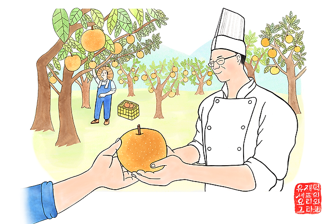 나는 그의 배를 맛보며, 이 훌륭한 식재료를 가지고 우리 호텔 레스토랑에 어울리는 어떤 상품을 개발할지 떠올렸다. 그러자 가슴이 두근거렸다. 옛말에 천우자조자(天佑自助者)라고 했다. 하늘은 스스로 돕는 자를 돕는다고 했으니 앞으로도 계속해서 우리나라 최고의 식재료들을 찾아 전국을 누비며 스스로를 열심히 도와야겠다. 그런데 이거 너무 재미있다. 훌륭한 식재료에는 맛 외에도 누군가의 인생과 철학이 이야기처럼 들어있었기 때문이다.