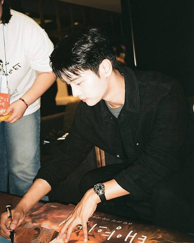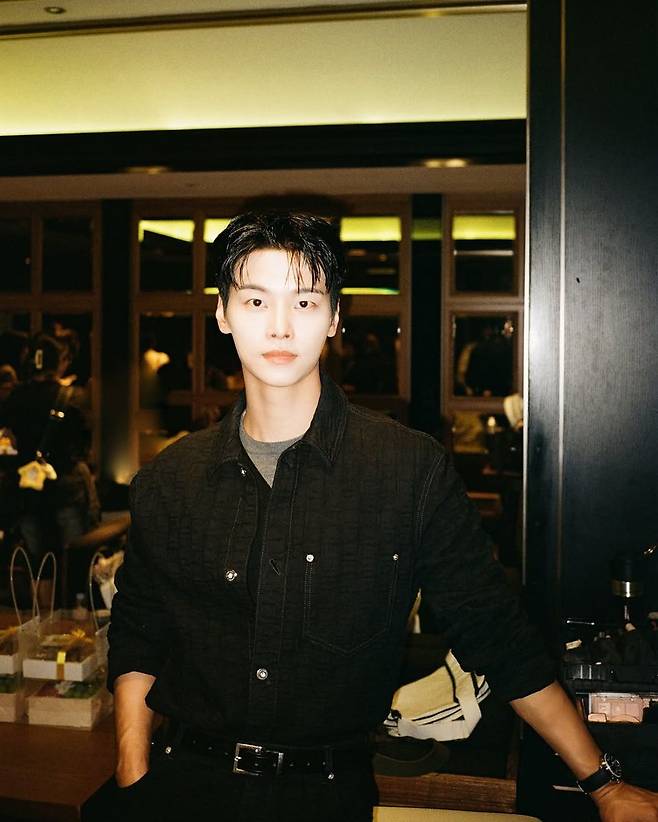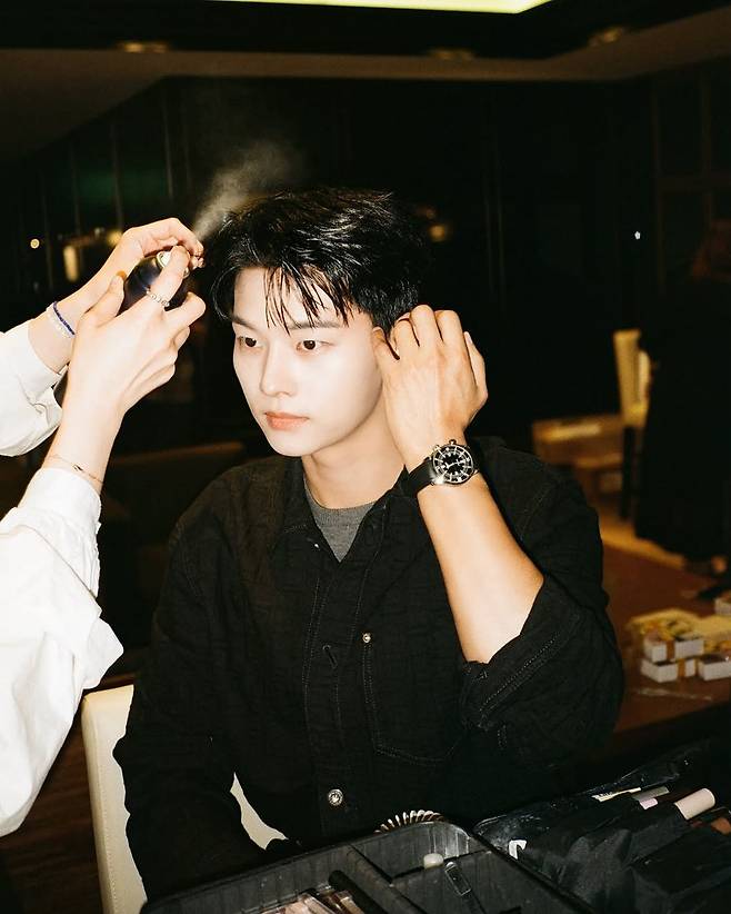 이번 착장의 핵심은 차분한 블랙 셔츠와 웨어러블한 시계 아이템이다. 셔츠는 은은한 워싱감이 느껴지는 텍스처로 자연스러운 빈티지 무드를 연출했으며, 단추를 끝까지 채운 포멀한 스타일링이 얼굴의 단정함을 배가시켰다. 손목에는 메탈 디테일이 돋보이는 블랙 스트랩 시계를 매치해 전체적인 룩에 강인함을 더했다. 피부 톤을 더욱 살려주는 내추럴 메이크업과 함께 깔끔하게 넘긴 헤어 스타일은 그의 또렷한 이목구비를 강조하며 시선을 사로잡았다.