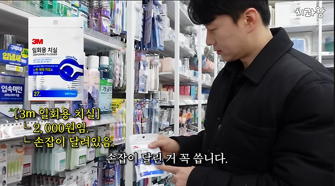 그는 다이소에서 판매하는 '3M' 제품을 소개했다. "'3M'을 보통 유명 테이프 제조사나 본드 회사로 알고 있지만, 사실 유명한 치과 기업이다"라고 말하며 3M 치실을 추천했다.