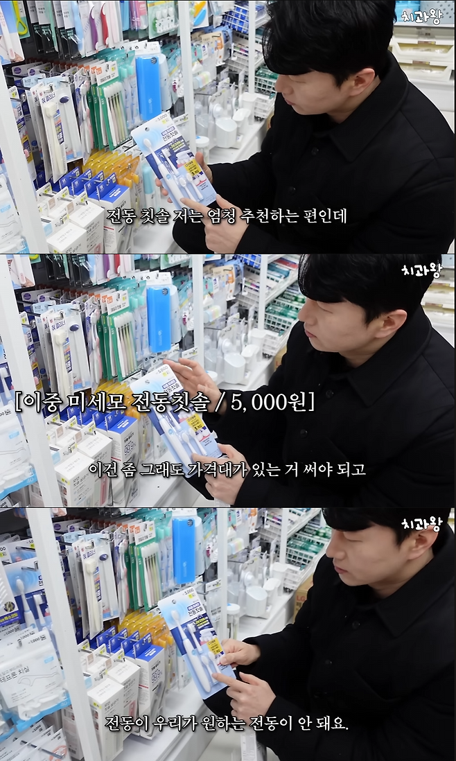 영상 속 소개된 5천원짜리 전동 칫솔은 진동이 충분하지 못하다며 구매를 만류했다. 시중에는 다양한 가격대의 전동칫솔이 존재하지만, 저가형 제품은 진동이 충분하지 않아 효과가 떨어질 수 있다. 따라서 "최소 5만원 이상의 제품을 추천한다"고 말했다.