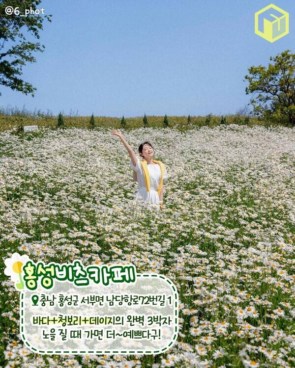 노을이 아름다운 홍성에 위치한 비츠카페에서는 새파란 바다와 싱그러운 청보리, 그리고 새하얀 샤스타데이지를 모두 감상할 수 있습니다. 대형카페인 비츠카페 야외 정원에는 데이지와 청보리 군락이 넓게 펼쳐져 있는데요. 정원 곳곳에 포토존처럼 꾸며진 야외 좌석도 놓여 있어 다양한 사진을 남기기 좋습니다.