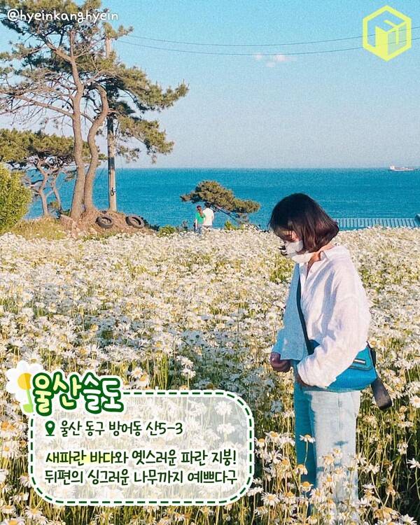 울산 슬도의 샤스타데이지 군락지는 옛 감성이 담긴 파란 지붕의 집과 새파란 바다가 보이는 언덕 위에 조성되어 있습니다. 울산 슬도 주차장에서 언덕으로 약 10여분을 올라가면 샤스타데이지 군락이 한 눈에 담기는데요. 데이지꽃밭 뒤로 넘실대는 바다가 함께 보입니다.