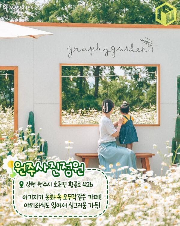 아기자기한 소품들이 가득해 따뜻한 동화 속 오두막을 연상케하는 샤스타데이지 명소 원주의 사진정원입니다. 야외 테라스에 조성된 좌석은 미니 결혼식장을 보는 듯 꿈같은 분위기로 꾸며져 있는데요.