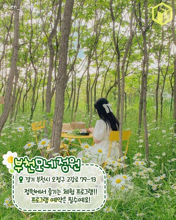 서울 근교 샤스타데이지 명소로 추천하는 부천의 모네정원입니다. 넓은 정원의 야외 좌석에서 다양한 생태체험 프로그램을 즐길 수 있는데요. 5월에서 7월 사이에는 데이지 플라워클래스, 반려식물심기가 진행되며 텃밭체험으로는 매실체험과 감자체험이 진행되니 예약시 참고하시면 되겠습니다.