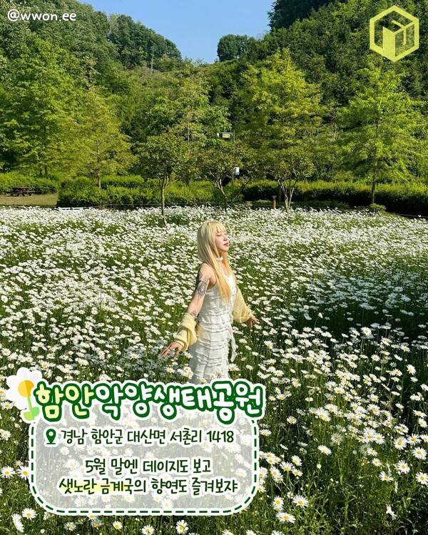 함안 악양생태공원은 남강에 맞닿아있는 생태공원으로 사계절 다채로운 꽃이 피어나 시민들과 나들이객의 휴식처가 되어주고 있는 샤스타데이지 명소입니다. 5월 중순부터 6월 중순까지는 새하얀 샤스타데이지와 노란빛의 금계국이 만발해 동화같은 풍경을 선사하는데요.