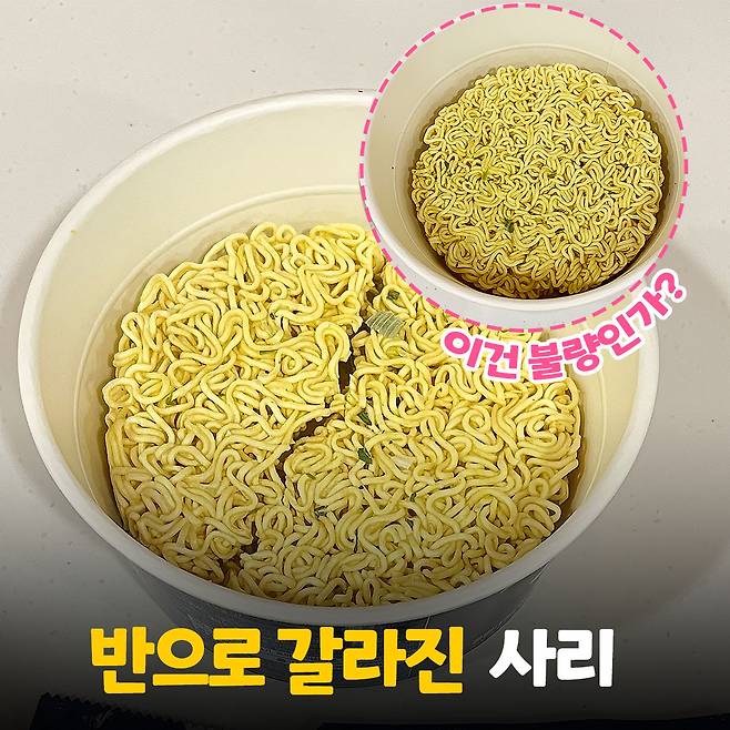 신기한 것은 라면 사리가 반으로 나뉘어 있다는 거예요. 이런 컵라면은 처음 봐서 굉장히 신기했어요. 노린 것인지 단순히 부숴진 건진 모르겠지만 다른 후기들에서도 같은 모습으로 나타난 것으로 보아 어쩌면 설계(?)일 지도...?