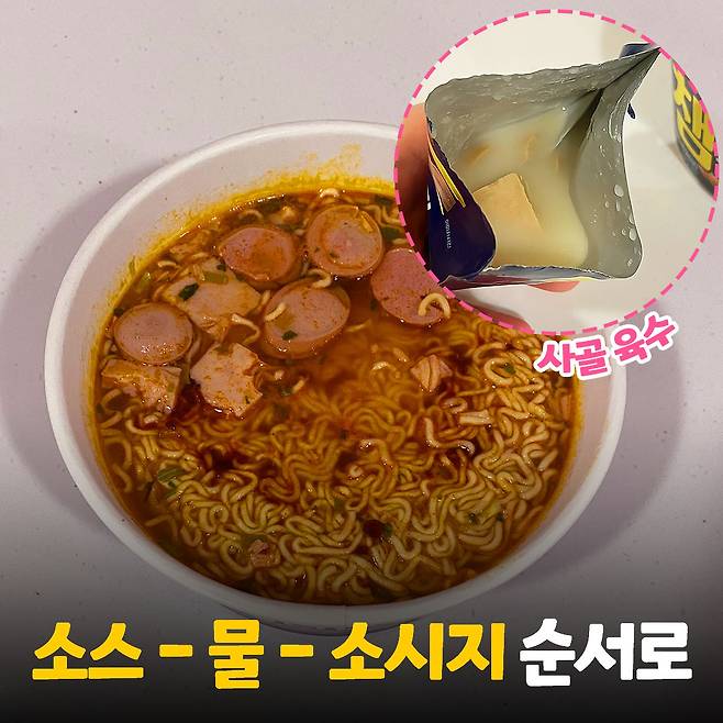 소시지를 넣을 차례에요! 햄과 소시지는 고소한 사골 국물에 잠겨 있으니 뜯을 때 꼭 주의하세요! 챔과 소시지를 라면에 쏟을 때 뽀얀 국물도 같이 나와요. 함께 넣으면 풍미가 더 진해진다고 해서 넣어볼게요!