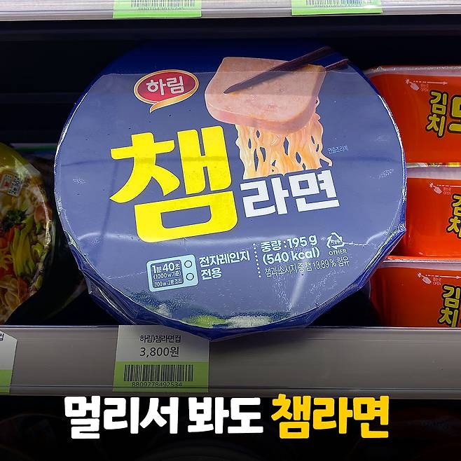 매대에 있는 챔라면! 매대에 놓인 다른 라면보다 큰 사이즈와 범상치 않은 가격을 뽐내고 있어요. 포장지에 햄과 라면의 조합을 볼 수 있는데요, 햄 사이즈가 굉장히 커서 눈길을 사로잡더라고요.