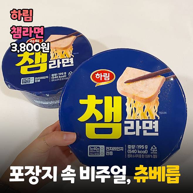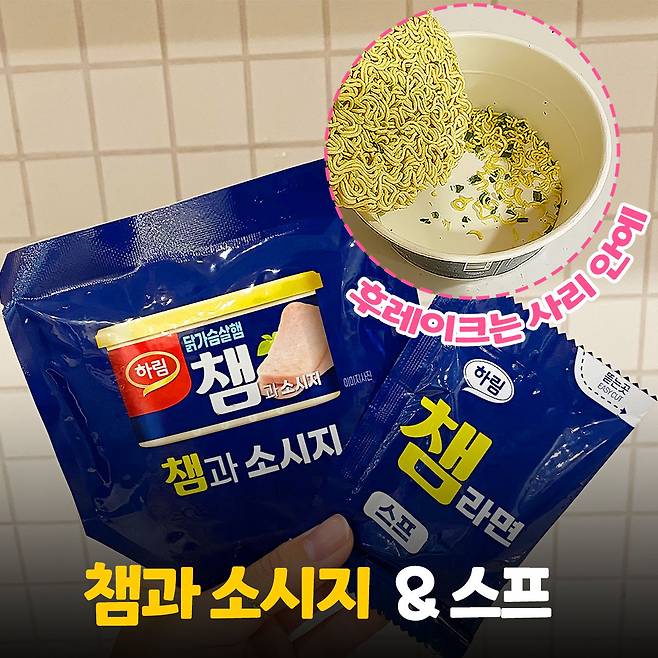 챔라면은 100% 국내산 닭가슴살로 만든 치킨햄과 소시지를 넣었다고 해요. 치킨햄을 빠르게 말하면 ‘챔’이 되는 상황을 제품명으로 사용했을 만큼 치킨햄이 포인트! 챔은 하림이 만든 3% 미만의 지방을 함량하고 있는 저지방 고단백 닭가슴살 햄입니다.