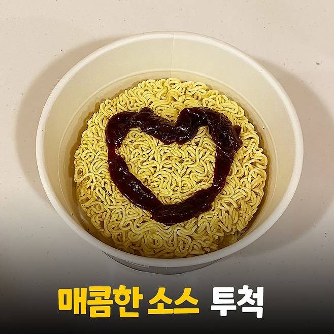 포장지에 적힌 조리 방법으로 만들어 볼게요! 뚜껑을 완전히 떼어낸 후 면 위에 스프를 넣습니다. 붉은 소스가 면 위에 안착! 스프는 분말이 아닌 빨간색 액상 소스더라구요. 소스 양은 넉넉한 편이었고 뜨거운 물을 표시선까지 부어주면 1단계 완성!