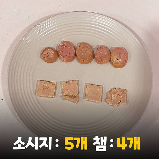 챔과 소시지를 넣기 전에 과연 몇 개가 들어 있을지 개수를 세어 볼게요. 소시지는 5개, 챔은 4개가 들어있어요. 만족하기엔 뭔가 아쉬운 양과 사이즈인 것 같아요.