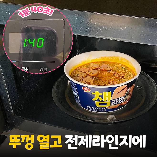 뚜껑을 제거한 라면을 전자레인지에 넣고 1분 40초간 돌려줍니다! 시간이 지날수록 맛있는 냄새가 번져서 군침이 싹 돌더라고요.