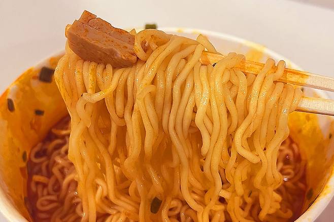 한 마디로 특징이 없는 맛으로 느껴져요. 국물이 색깔만큼 얼큰하지도 않고, 면발에 국물이 스며들지 않아 전체적으로 밍밍한 맛이었어요.