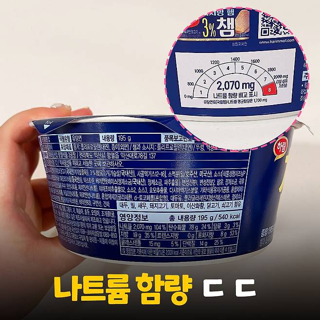 그리고 어마어마한 나트륨 함량. 1일 나트륨 섭취 기준량이 2,000mg인데, 챔라면의 나트륨 함량은 2,070mg입니다. 하루 섭취 기준량을 넘겨버리는..! 아마 햄이 나트륨 함량에 큰 영향을 미쳤을 것 같아요.