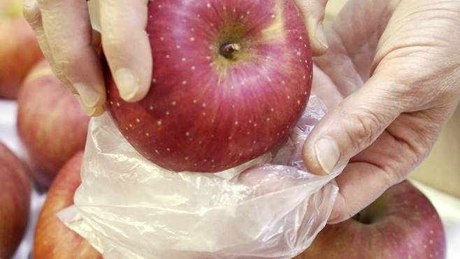 이제 다음으로 중요한 비닐봉지에 넣는 과정! 사과를 오랫동안 보관하기 위해선 수분이 날아가지 않게 해주어야 하는데요. 그냥 냉장고에 둘 경우 수분이 쉽게 날아가 쉽게 망가질 수 있답니다.