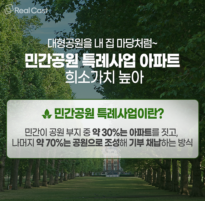 대표적인 예가 민간공원 특례사업으로 분양하는 단지입니다. 민간공원 특례사업은 5만㎡ 이상의 공원을 민간이 70% 조성해 기부채납하고, 나머지 30% 부지에 아파트를 짓는 사업 방식을 말하는데요.