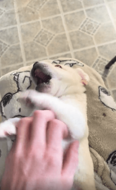 주인이 조심스럽게 강아지의 배 위에 손을 올리자, 강아지의 반응은 생각보다 단호합니다. 처음에는 잠시 멈칫하다가, 이내 네 발을 허공에 뻗어 온몸으로 발버둥을 치기 시작하는 것이죠. “그건 내 배야! 내 허락 없이 만지지 마요!”라는 듯이 말이죠.