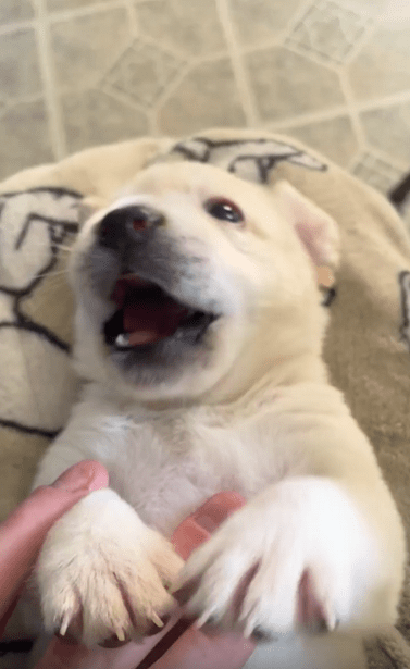 작고 복슬복슬한 흰색 새끼 강아지 한 마리가 등을 대고 누워 있습니다. 다리도 짧고 배도 통통한 이 강아지는 아직 두 달밖에 되지 않은 꼬물이. 그 모습만으로도 충분히 사랑스럽지만, 이 아이가 진짜 존재감을 드러내는 건 주인의 손이 다가올 때부터입니다.