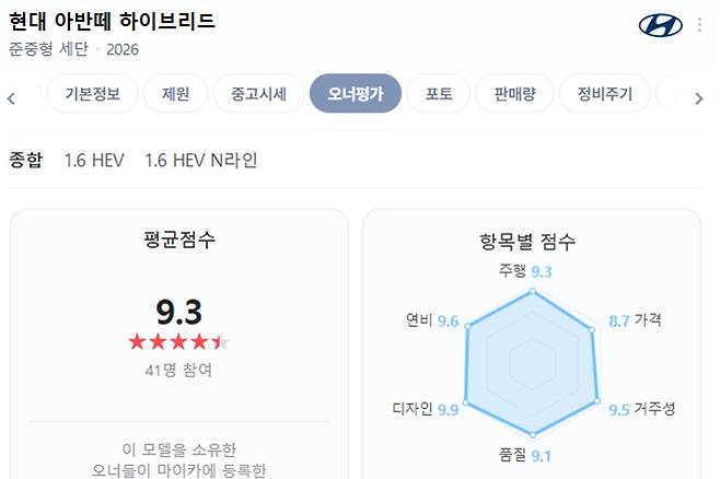 실제 차주들의 평가를 기반으로 차량 만족도 점수를 공개하는 ‘네이버 마이카 오너평가’에 따르면 현대차 아반떼 하이브리드의 오너평가 평균 점수는 9.3점이다.