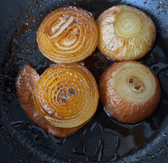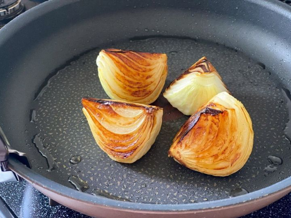 양파는 겉껍질을 벗긴 뒤 8등분으로 큼직하게 자르는 것이 가장 좋다. 이렇게 하면 팬에 구울 때 단면이 넓어져 카라멜라이징이 잘 되고, 속은 촉촉하게 남는다. 얇게 썰면 수분이 너무 많이 날아가 식감이 푸석해질 수 있기 때문에 큼직한 모양을 유지하는 것이 좋다.