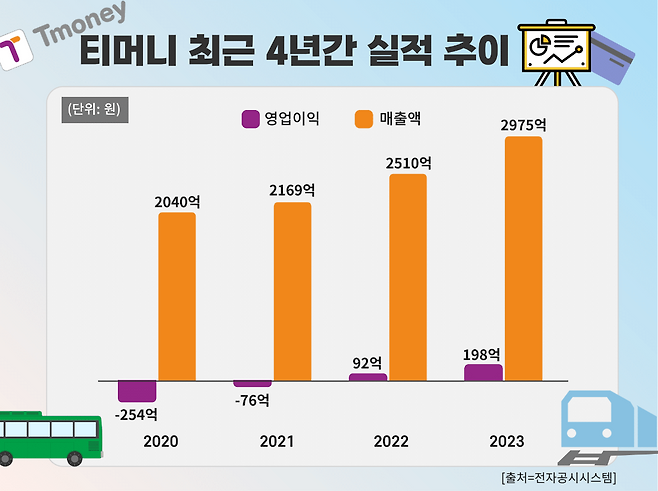전자공시시스템에 공개된 티머니의 최근 4년간 실적은 날이 갈수록 상승하고 있다. 영업이익이 2040억원이던 지난 2020년 이후 꾸준히 증가해 지난 2023년에는 2975억원을 기록했다.