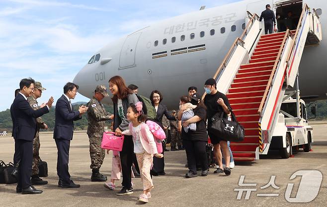 (서울=뉴스1) 사진공동취재단 = 이스라엘이 무장단체 헤즈볼라를 겨냥해 레바논에서 전방위적으로 공세를 강화하고 있는 가운데 레바논에 체류 중이던 우리 국민들이 5일 경기도 성남시 서울공항을 통해 도착해 군 수송기에서 내리고 있다. 2024.10.5/뉴스1