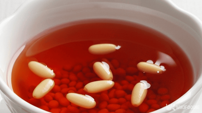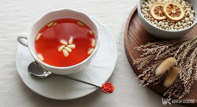오미자 물은 미리 준비해야 한다. 오미자 2컵에 물 3컵, 설탕, 꿀을 넣어 하루 정도 우려낸다. 이후 체에 걸러 신맛을 줄이고 단맛을 조절한다. 배를 얇게 썰어 꽃 모양으로 준비하거나, 잣을 곁들이면 장식으로 좋다. 보리 경단에 오미자 물을 붓고 얼음을 넣은 뒤, 그 위에 올려 마무리한다.