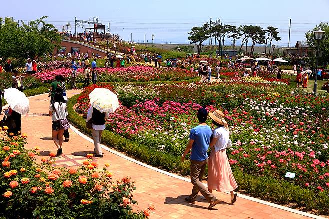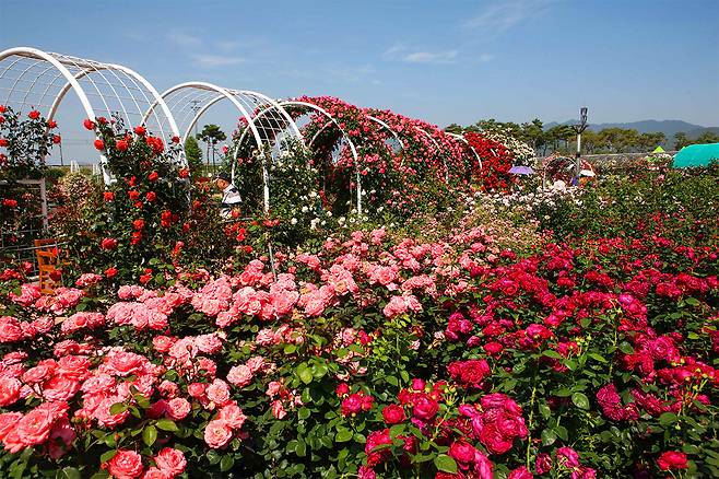 붉은 장미의 정열적인 매력부터 분홍 장미의 사랑스러운 색감, 보랏빛 장미의 고혹적인 향기까지 다채롭게 펼쳐져 장관을 이룹니다.
