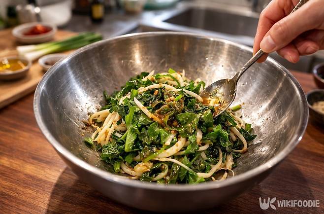 4. 참기름 1큰술, 연두 1큰술, 깨 1큰술을 넣고 가볍게 무친다.
