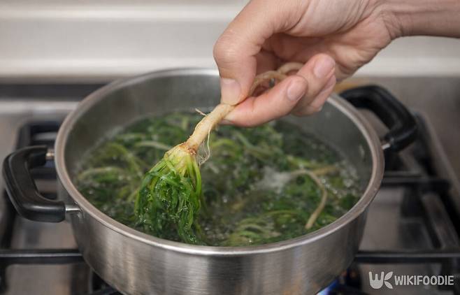 2. 끓는 물에 소금 약간을 넣고 30초에서 45초 데친다.