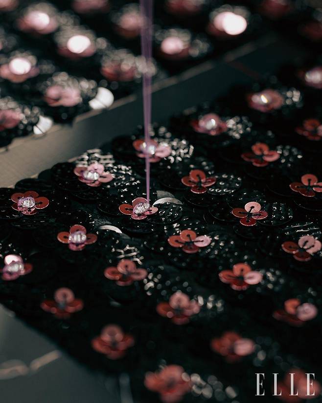 르사주 공방에서 제작한 자수 장식 디테일과 이를 활용한 룩.