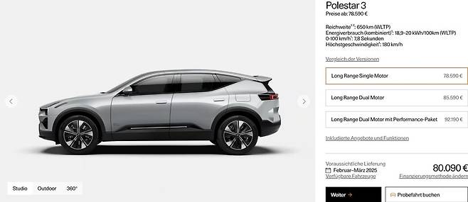 폴스타 3 후륜 롱레인지 싱글모터 모델은 독일 판매가 기준 7만9,890유로(약 1억1,900만원)부터 시작한다.