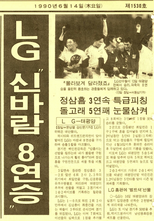 LG는 이날부터 완전히 다른 팀으로 변모했다. 광주 3연전을 싹쓸이하더니 롯데, 삼성, 태평양을 만나 연전연승. 6월 13일 잠실 태평양전 5-2 승리로 창단 후 최다연승인 8연승을 질주했다.