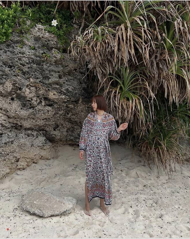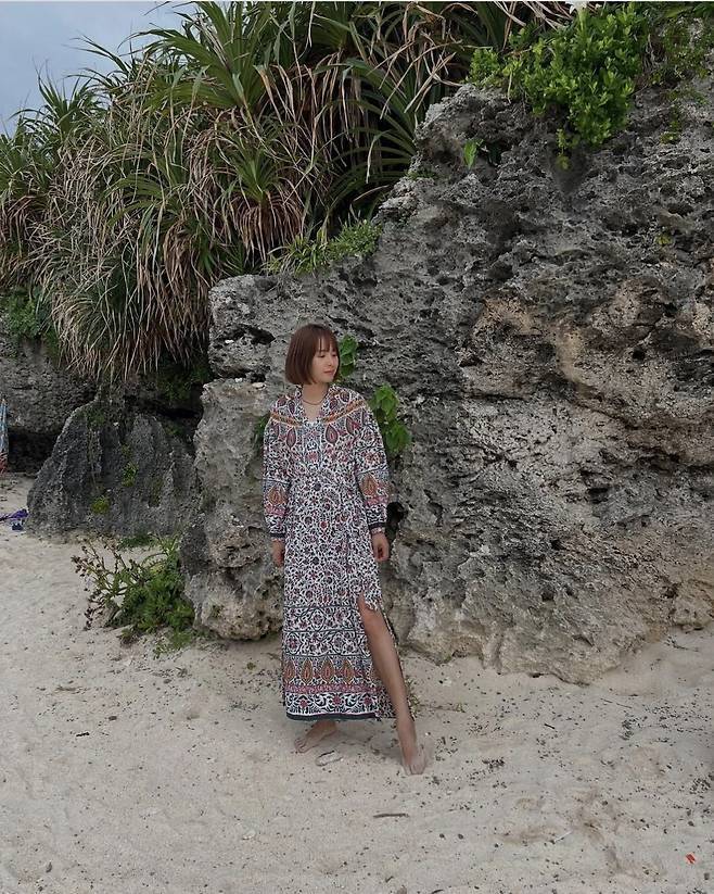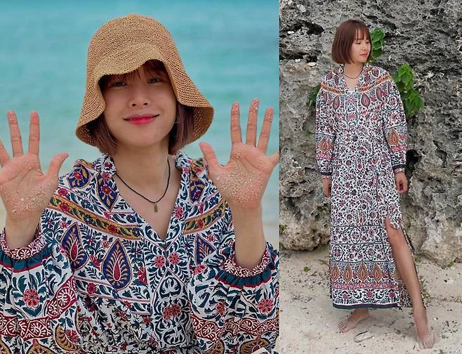 조윤희는 화려한 플로럴 패턴과 에스닉 무드가 가득한 롱 원피스를 착용해 이국적인 분위기를 자아냈습니다.