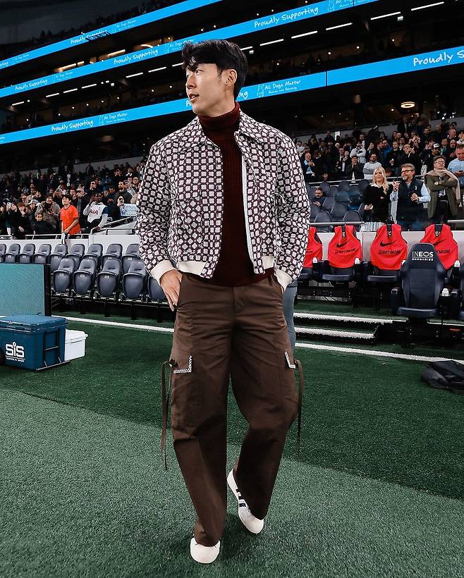손흥민은 이날 사복 차림으로 경기장을 방문했는데, 이날 손흥민의 착장이 꽤 큰 화제를 모으고 있다. 손흥민은 버건디 컬러 패턴의 봄버 자켓에 짙은 브라운 카고팬츠에 아디다스 스니커즈를 매치했다. 팔로워만 7551만 명 이상을 자랑하는 글로벌 축구 플랫폼 계정 '433'은 손흥민의 사진을 공유하며 화려한 폰트로 '스타일리시 쏘니(Stylish Sonny)'라고 언급했다.