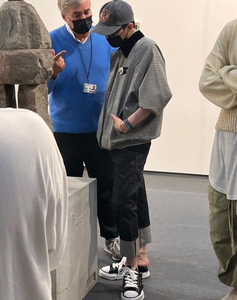 미우미우 체크 블루종을 입고 미술작품 관람중인 지디. 샤넬보다 영하고 힙한 느낌이 강한 미우미우의 이미지와 개성 강한 지디의 조합이 시너지를 효과를 만들어냈다.